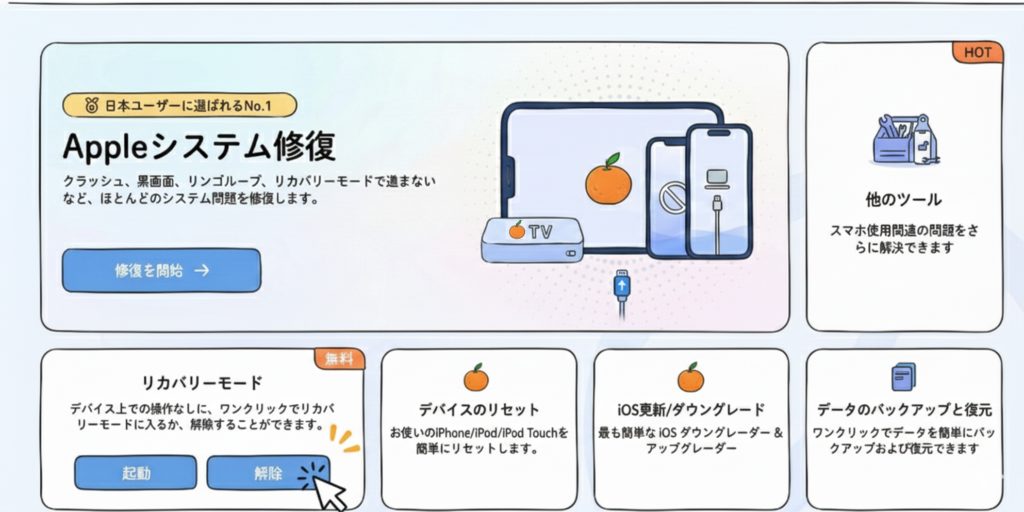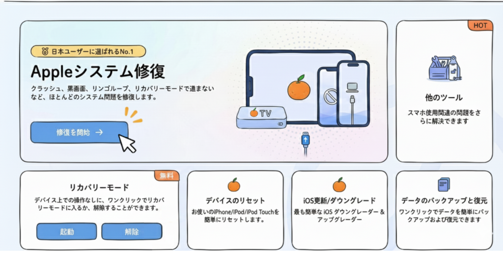 • iPhone/iPadのさまざまな不具合(リンゴループ、フリーズ、起動しないなど)を修復する機能を保有