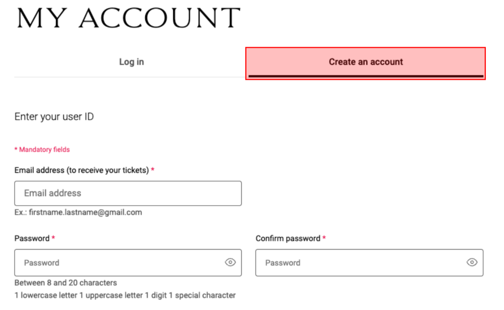 公式サイト(Billetterie du Louvre)へアクセスし、アカウントを作成します。言語はお好みですが、今回は英語に設定しました。