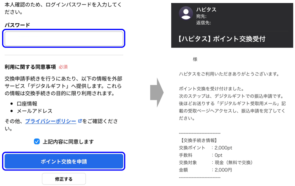 - これで「ポイント交換受付」のメールが届き、【ステップ1】が完了となります。