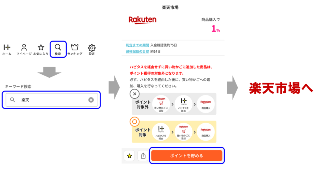 各案件には必ず「ポイント獲得条件」があります。楽天市場の場合、「ハピタスを経由する前にカートに入っていた商品は対象外」といったルールがあります。事前に商品をお気に入り登録しておき、必ず経由後に商品をカートに入れましょう。