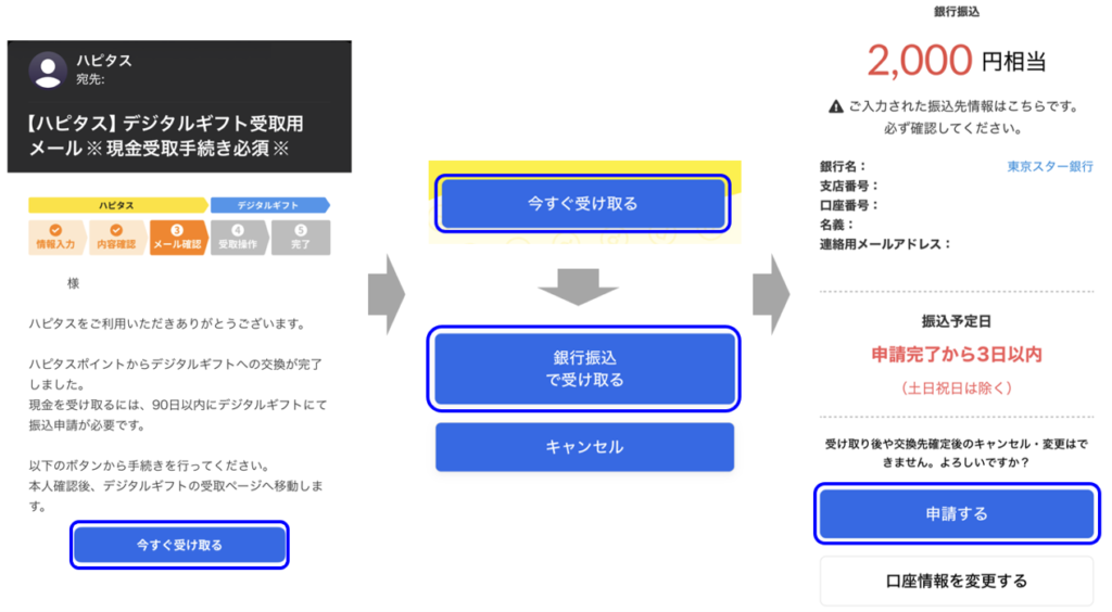 - 次の画面で「今すぐ受け取る」をタップし、さらに次の画面で「銀行振込で受け取る」をタップします。