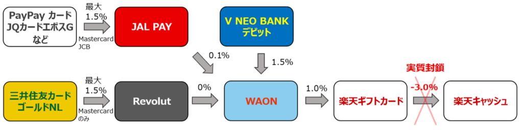 クレジットカードから直接チャージするのではなく、高還元クレカ → 中継カード(JAL Payなど) → WAON → 楽天ギフトカード購入→楽天キャッシュチャージ というルートを通すことで、ポイントの多重取り(2.5%〜3%還元など)が可能でした。