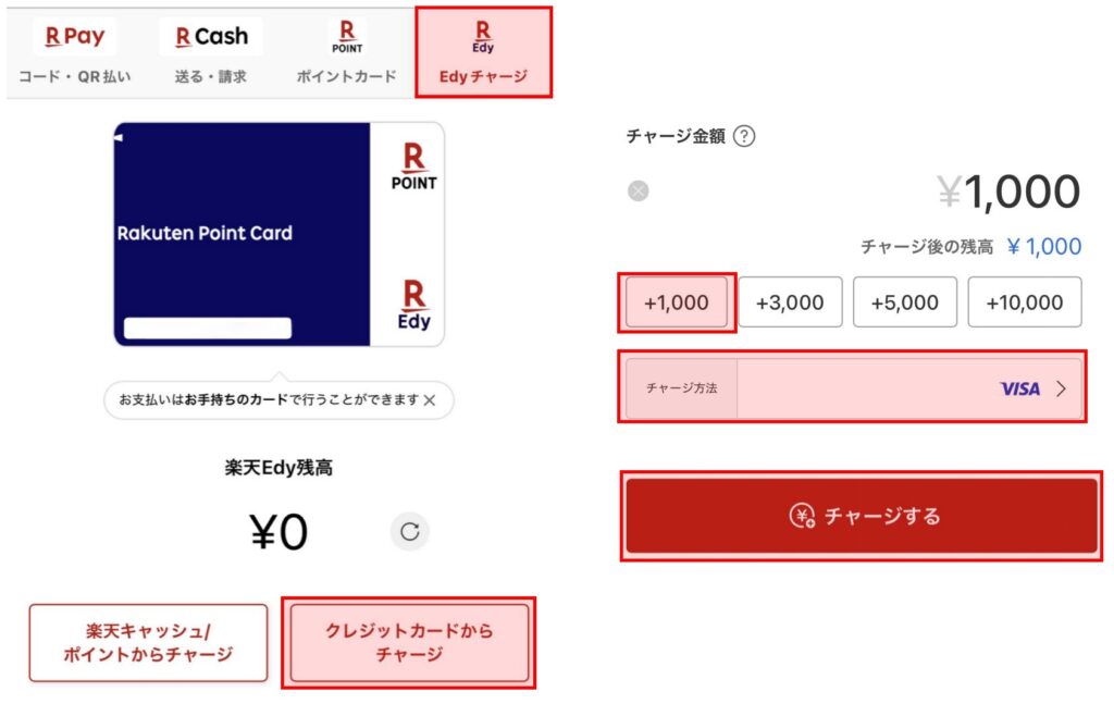 1. 楽天Payアプリの「Edyチャージ」タブ→「クレジットカードからチャージ」をタップしリアルEdyカードをスキャン