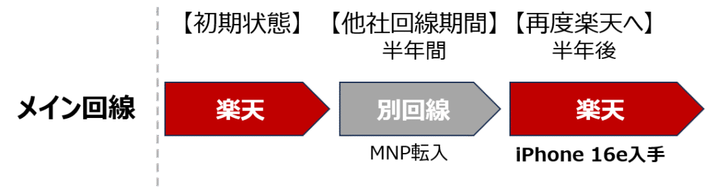 現楽天モバイル回線を他社へMNP転出(一時避難) → 半年以上空けて → 転出先からMNP転入という形でiPhone 16eキャンペーンを利用し、楽天モバイルに戻る