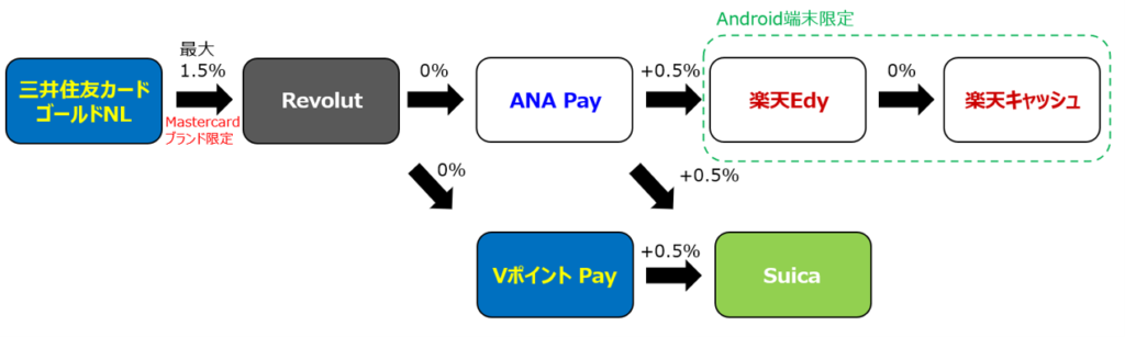 なお、本カードは2026年3月1日に100万円決済修正対象となるチャージ先がほとんどなくなってしまうことが予定されており、楽天キャッシュまでのルートをお得に利用するためにはAndroid端末が必須となってしまいますが、ルートが残っているだけで強力と言える時代になってきています。