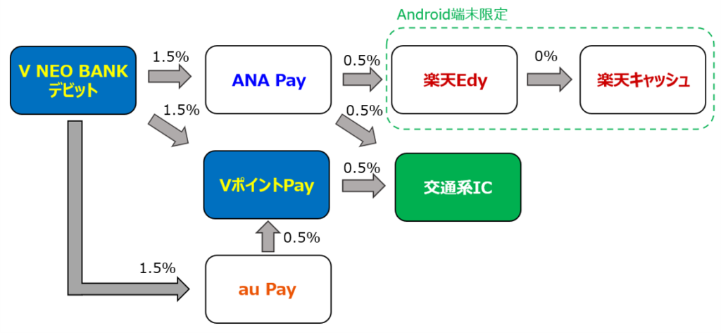 V NEOBANKデビットから「VポイントPay」にチャージし、リアルカードを使用する裏技があります。詳細は別記事「VポイントPayをリアルカード運用する裏ワザ」をご参照ください
